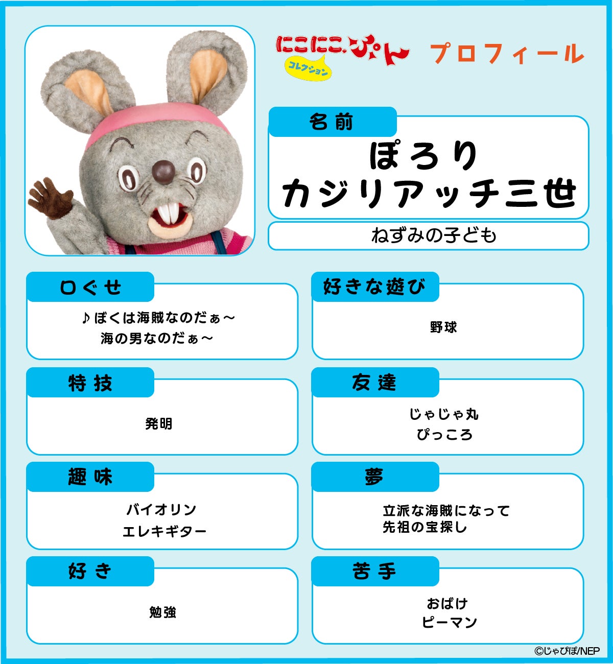 やぁ、みんな。ぼくの祖先が名門の海賊だってこと、知っているかな?え?知らなかったって?ヨヨヨヨ。ぼくたちのお話の第1話「ないってばない?」と第2話「ぼくはかいぞく」にでてくるから、しっかりみてほしいのだ!え?ぼくが、ピーマンが嫌いで、泣き虫だって?そそそんなこと…どうだったかなぁ?ぼくたちの暮らしているにこにこ島は、毎日がとってもたのしいのだ!みんなもあそびに来てくれるとうれしいなぁ!