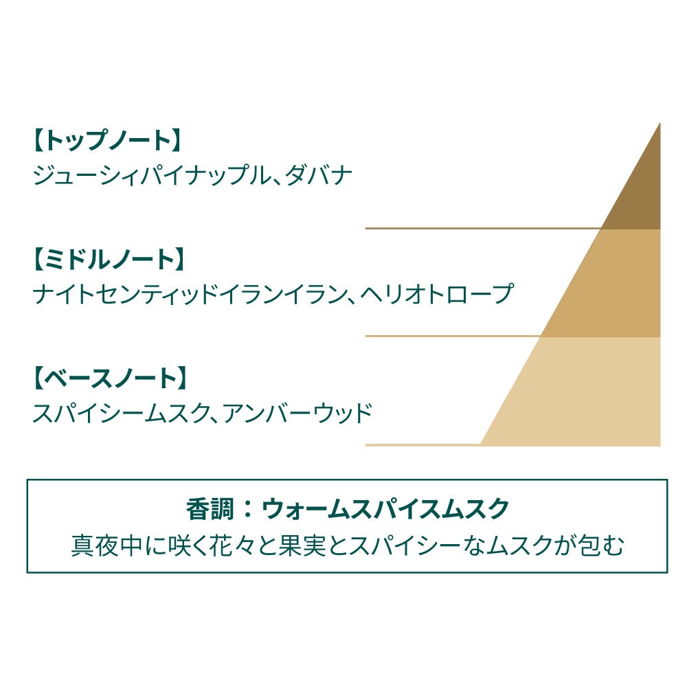 甘くジューシィなフルーツにナイトセンティッドイランイランやヘリオトロープの甘い香りとスパイシーなムスクが香る、特別なシリーズです。深みのある魅惑的な香りが、まとう人の想像力を掻き立て魅了します。