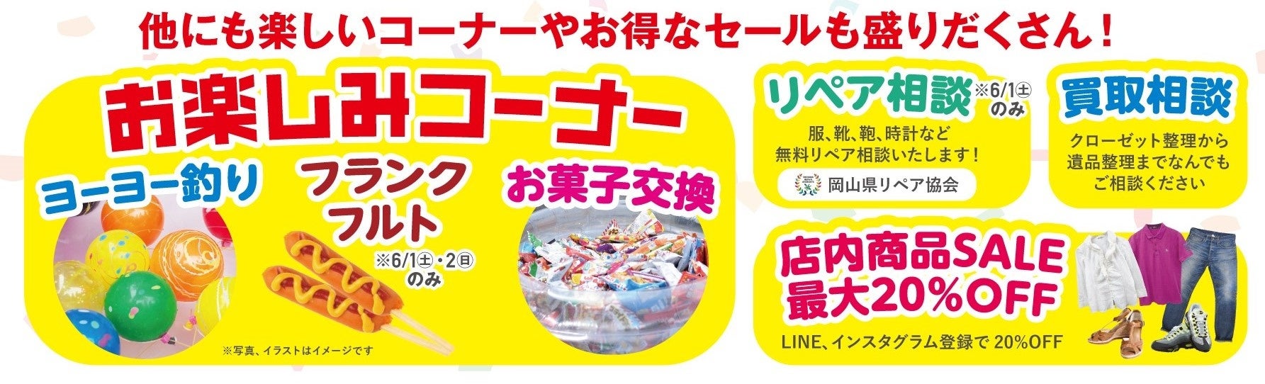 今回初の試みとして、岡山県リペア協会と連携し、6月1日(土)に無料でリペア相談を受け付けます。またイベント期間中、断捨離や遺品整理などの、買取相談も随時対応します。
