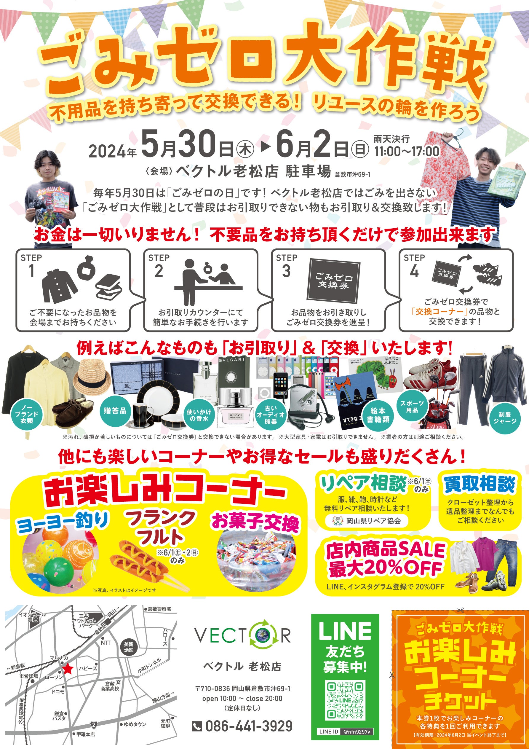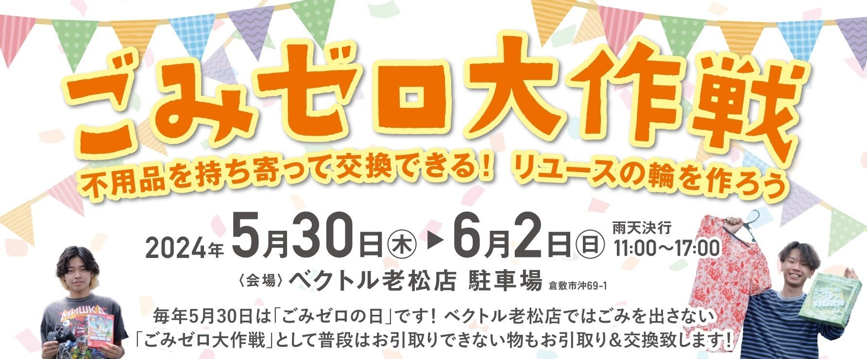 「ごみゼロの日(5月30日)」から4日間、誰でも楽しみながらリユースを体験できる物々交換イベントをリサイクルショップ「ベクトル」老松店の駐車場で開催します。お子様向けにヨーヨー釣りやお菓子交換コーナーも用意しております。