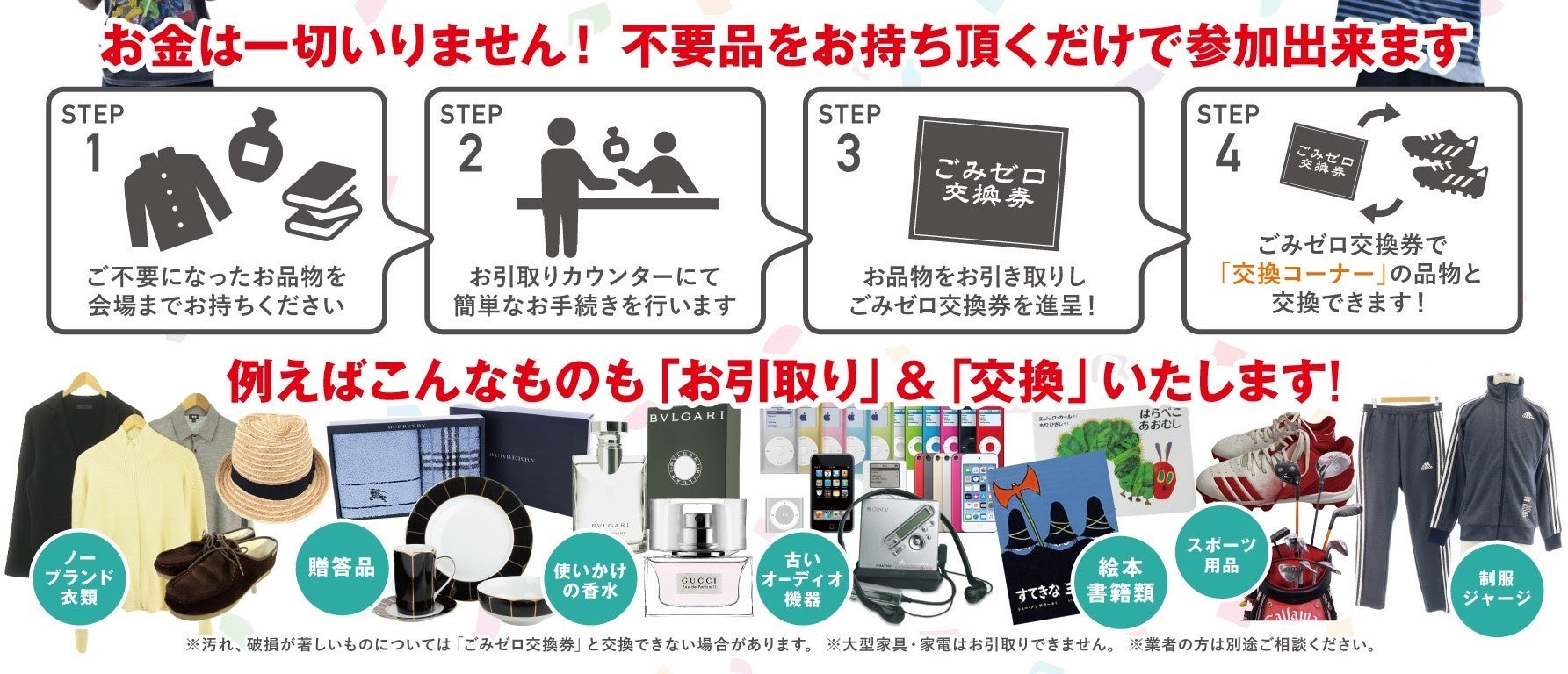 イベント当日に、自宅のクローゼットや押し入れで眠っている不用品を会場にお持ち込みください。お持ち込み点数に応じ、お引取りカウンターで「ごみゼロ交換券」をお渡しいたします。交換券1枚につき、会場に置いてあるアイテムの中から気に入った商品を1つ選び交換することが可能です。持ち込み点数に制限はございません。書籍やスポーツ用品など、普段ベクトル老松店では取り扱っていないアイテムも交換または引き取り対象となっております。皆様に気持ちよくリユース体験をしていただくため、「汚れ・ダメージが少ない商品」のお持ち込みをお願いしております。