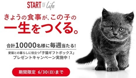栄養学に基づいて犬と猫の健康を実現する企業(Health Through Nutrition Company)として、プレミアムペットフードおよび食事療法食を展開するロイヤルカナン ジャポン(本社:東京都港区、社長:山本 俊之)は、子猫の健やかな成長を支援するため、子猫専用フードのお試しサンプルや、獣医師監修の子猫の育て方ガイドなどが入った「子猫ギフトボックス」を合計10,000名様にプレゼントする「Start of Life キャンペーン」を、4月4日(木)から6月30日(日)まで開催します。