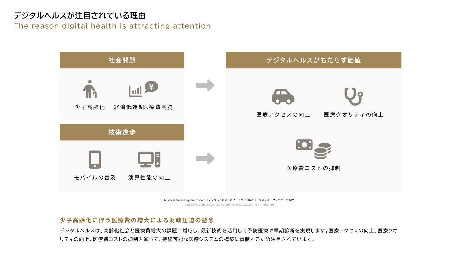 デジタルヘルスは、高齢化社会と医療費増大の課題に対応し、最新技術を活用して予防医療や早期診断を実現します。医療アクセスの向上、医療クオリティの向上、医療費コストの抑制を通じて、持続可能な医療システムの構築に貢献するため注目されています。