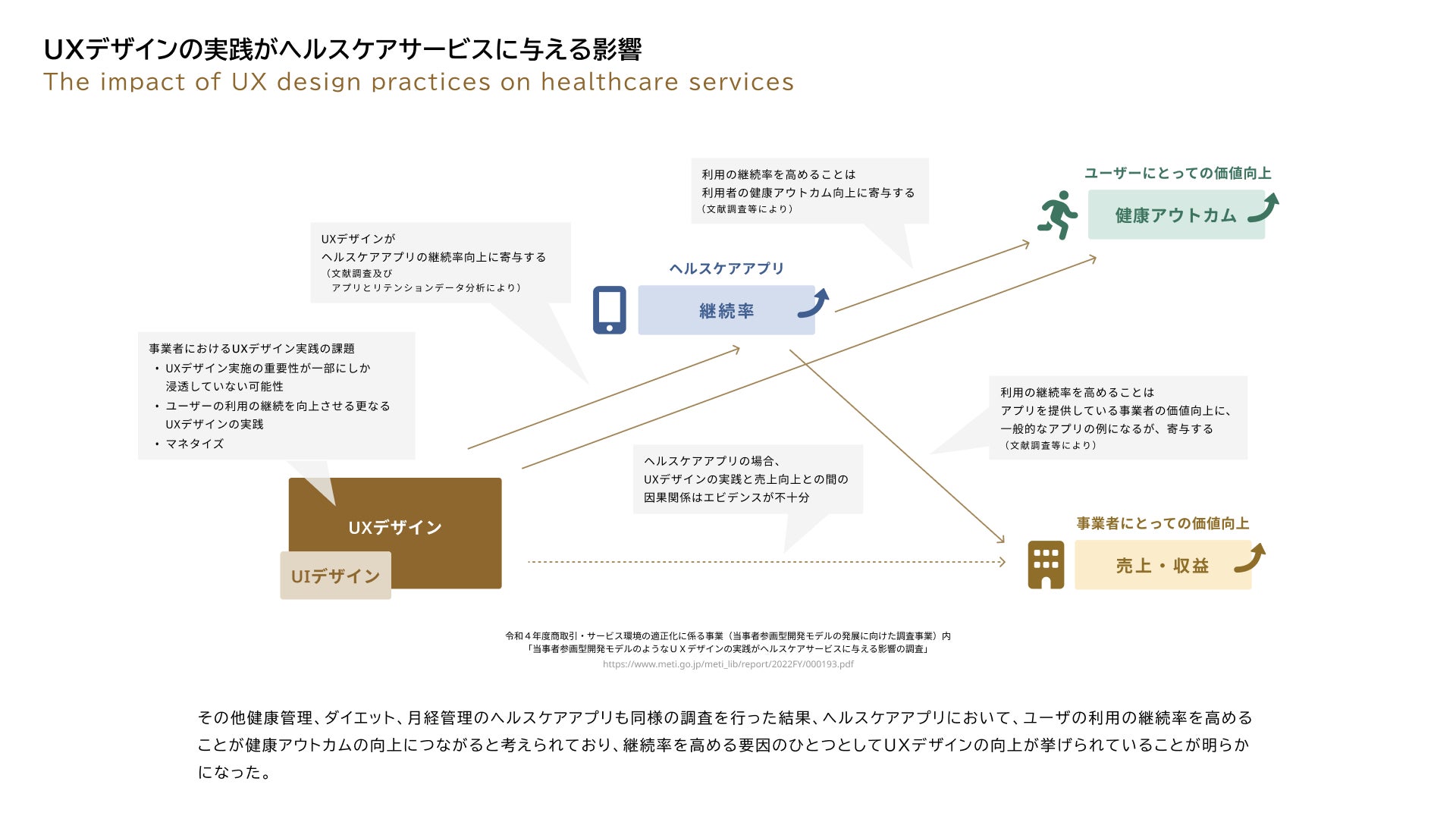 その他健康管理、ダイエット、月経管理のヘルスケアアプリも同様の調査を行った結果、ヘルスケアアプリにおいて、ユーザーの利用の継続率を高めることが健康アウトカムの向上につながると考えられており、継続率を高める要因のひとつとしてUXデザインの向上が挙げられていることが明らかになった。