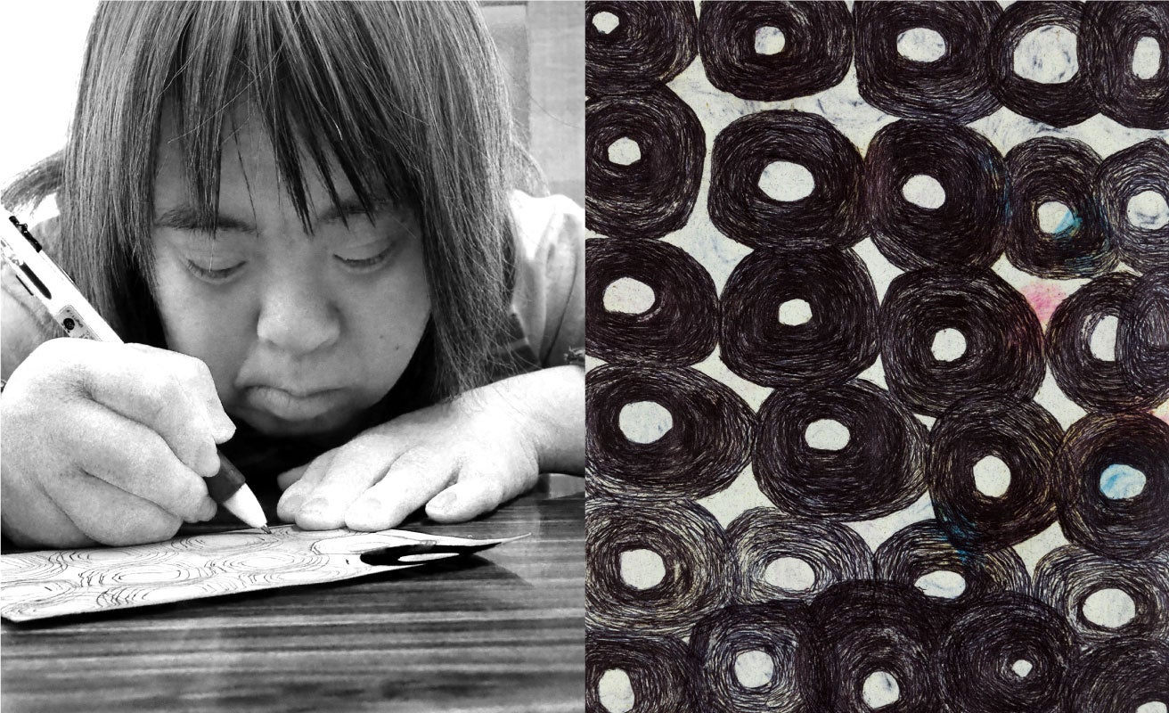ある時はふわふわと、夢見るように周囲の誰かに笑顔で話しかけていたり。またある時は、一人自分の内側の世界に深く意識を沈めていたり。工藤のまなざしは、彼女の心だけに映る何かを追いかけてたゆたう。 心を満たす幸福なイメージが浮かぶのか。それとも痛みや悲しみを心に映さないようにするためなのか。それとも。工藤の制作は、瞑想から生み出されるような果てしなさがある。自分が今なにかを作り出しているという意識はあるのだろうか――。彼女が描く時、縫う時、あるいはよくわからない「なにか」をしている時。ふとそんな疑問を感じさせる、不思議な空気が彼女の制作には漂っている。