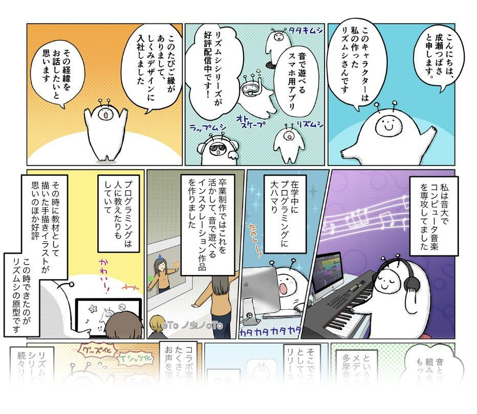 株式会社しくみデザイン(本社:福岡県福岡市博多区、代表取締役:中村俊介、以下「しくみデザイン」)は、「しくみでみんなを笑顔にする」という企業理念の下、2005年に誕生した福岡発の未来を創るクリエイティブカンパニーです。「しくみデザイン」は、新世代楽器アプリ「KAGURA(カグラ)」(パソコンのカメラで手や身体の動きを検知し、身体を動かすだけで触れることなく演奏できる新世代楽器)の開発や、ビジュアルプログラミングアプリ「Springin‘(スプリンギン)」を通じて子ども達にプログラミングで創造する楽しさを体験してもらい、日本のモノづくり産業の未来を担う創造的人材を育成することに力をいれています。この度、総計600万ダウンロードを誇る音で遊べるメディア・アート作品「リズムシ」シリーズを開発し、文化庁メディア芸術祭新人賞ほか受賞歴多数の「成瀬つばさ」さんが、しくみデザインに入社することが決定いたしました。