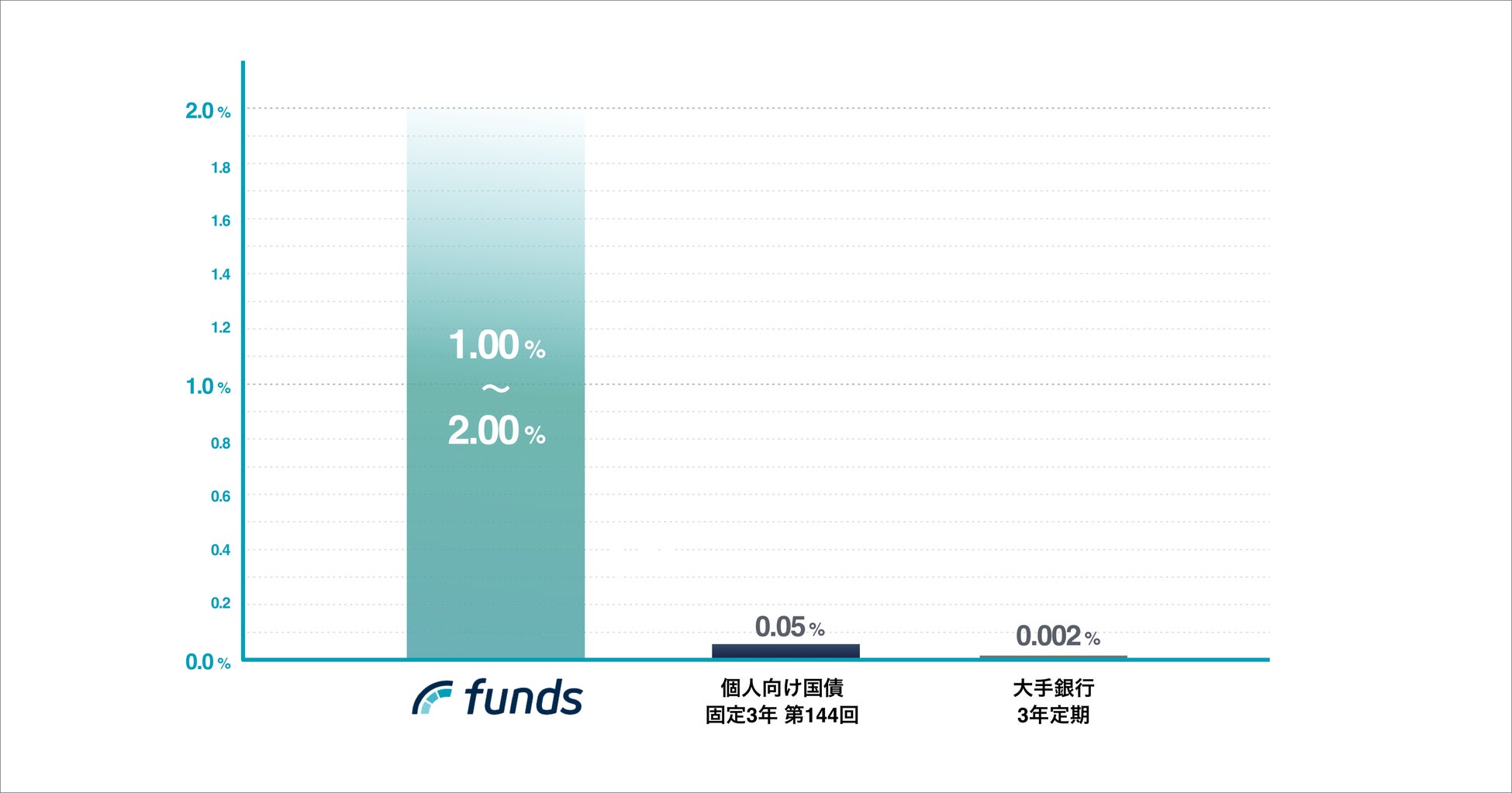 低金利が続く状況下の日本において、Fundsにラインナップされているファンドの利回りは1~2%台が中心です。また、ファンド募集時に固定利回りで運用期間が予定された金融商品ですので、直接相場の影響をうけず、安定的に資産形成をしていきたい層の方に寄り添った商品設計となっております。なお、「固定利回り」とは、ファンドの利回りが募集時に定められていることを意味しており、借り手企業の支払不能などの場合には予定どおりの分配が行われない可能性があります。