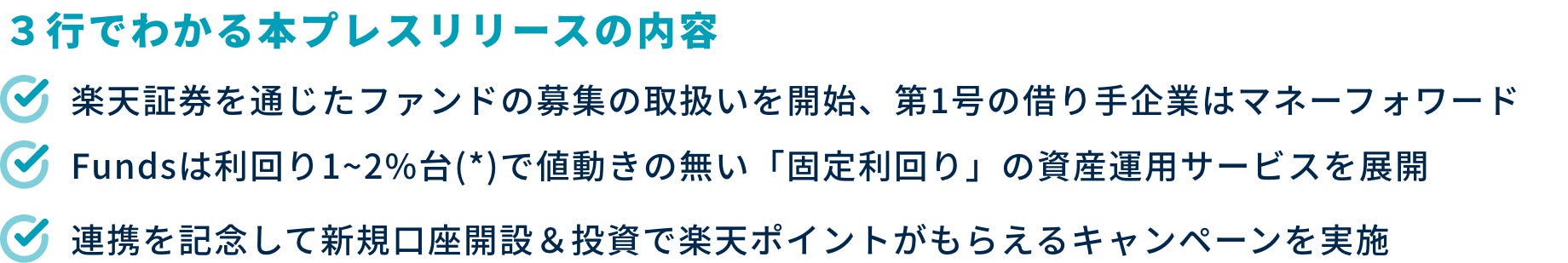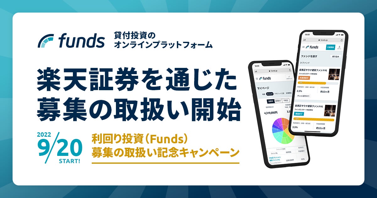 貸付投資のオンラインプラットフォーム「Funds(ファンズ)」を運営するファンズ株式会社(本社:東京都渋谷区、代表取締役CEO:藤田雄一郎、以下 当社)は、2022年9月20日より、楽天証券株式会社(本社:東京都港区、代表取締役社長:楠雄治、以下 楽天証券)を通じて、当社が取扱うファンドの募集の取扱いを開始することをお知らせいたします。