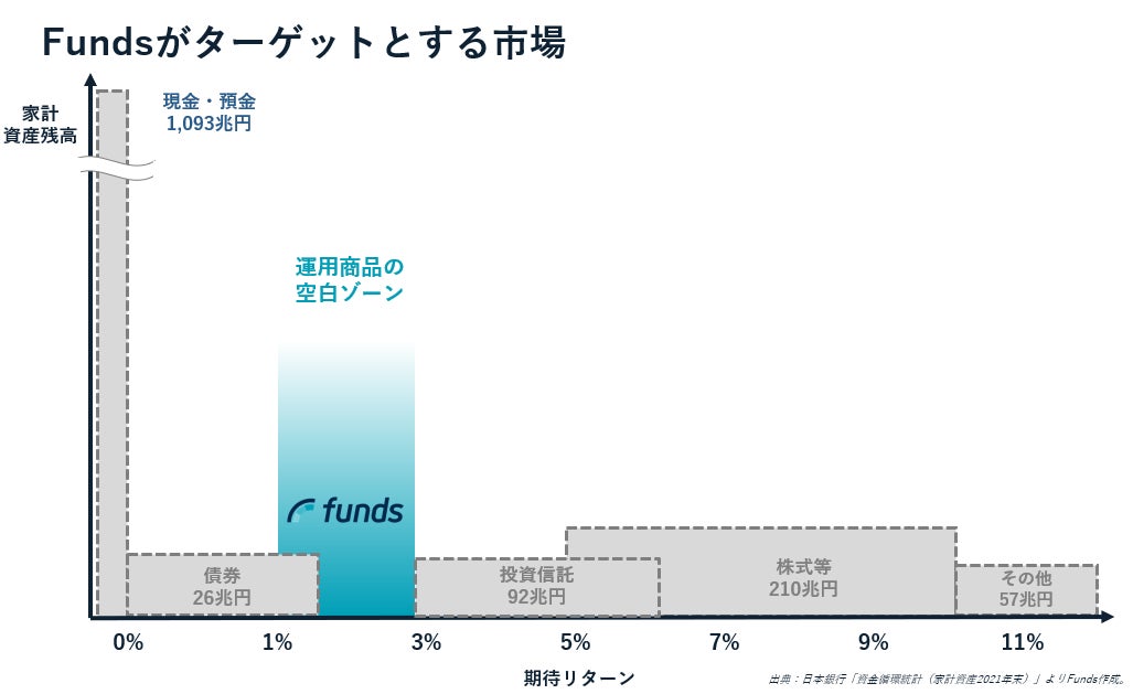 資産形成の手段としては、定期預金や債券、株式をはじめ様々な投資対象がありますが、Fundsでは預貯金と株式の間のリスクリターンを享受できる金融商品を提供しています。