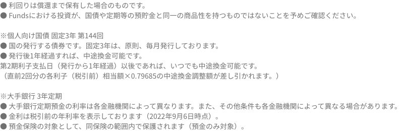 ・Fundsで取り扱うファンドは、元本が保証されているものではなく、欠損が生じる可能性があります。各ファンドの条件およびリスクの内容や性質の詳細は、重要事項説明書等をよくお読みください。