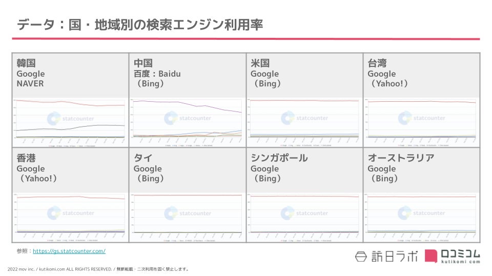 あと、シンプルに世界的なシェア率が高く「使っている人が多い」という意味でもGoogleを優先すると良いと思います。中国だけGoogleが使われていませんので、別途対策は必要になります。