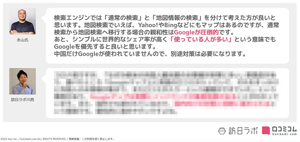 検索エンジンでは「通常の検索」と「地図情報の検索」を分けて考えた方が良いと思います。地図検索でいえば、Yahoo!やBingなどにもマップはあるのですが、通常検索から地図検索へ移行する場合の親和性はGoogleが圧倒的です。