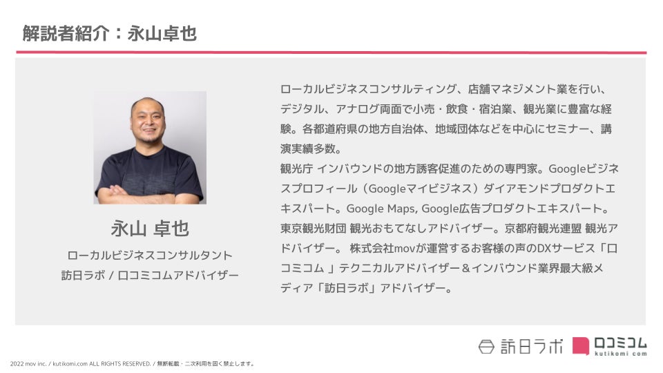 観光庁 インバウンドの地方誘客促進のための専門家。Googleビジネスプロフィール(Googleマイビジネス)ダイアモンドプロダクトエキスパート。Google Maps, Google広告プロダクトエキスパート。東京観光財団 観光おもてなしアドバイザー。京都府観光連盟 観光アドバイザー。 株式会社movが運営するお客様の声のDXサービス「口コミコム 」テクニカルアドバイザー&インバウンド業界最大級メディア「訪日ラボ」アドバイザー。