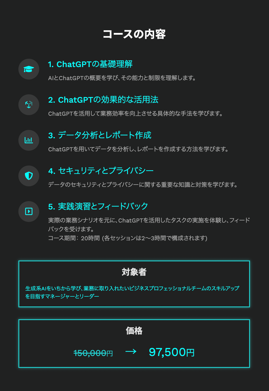このトレーニングコースは、ChatGPTを効果的に活用するためのスキルと知識を身につけたいと考える個人、または自社のスタッフにAIのノウハウを習得させたい企業に向けたものです。AIの基本的な概念からビジネスにおける活用方法まで、幅広いテーマを包括的に学ぶことが可能です。