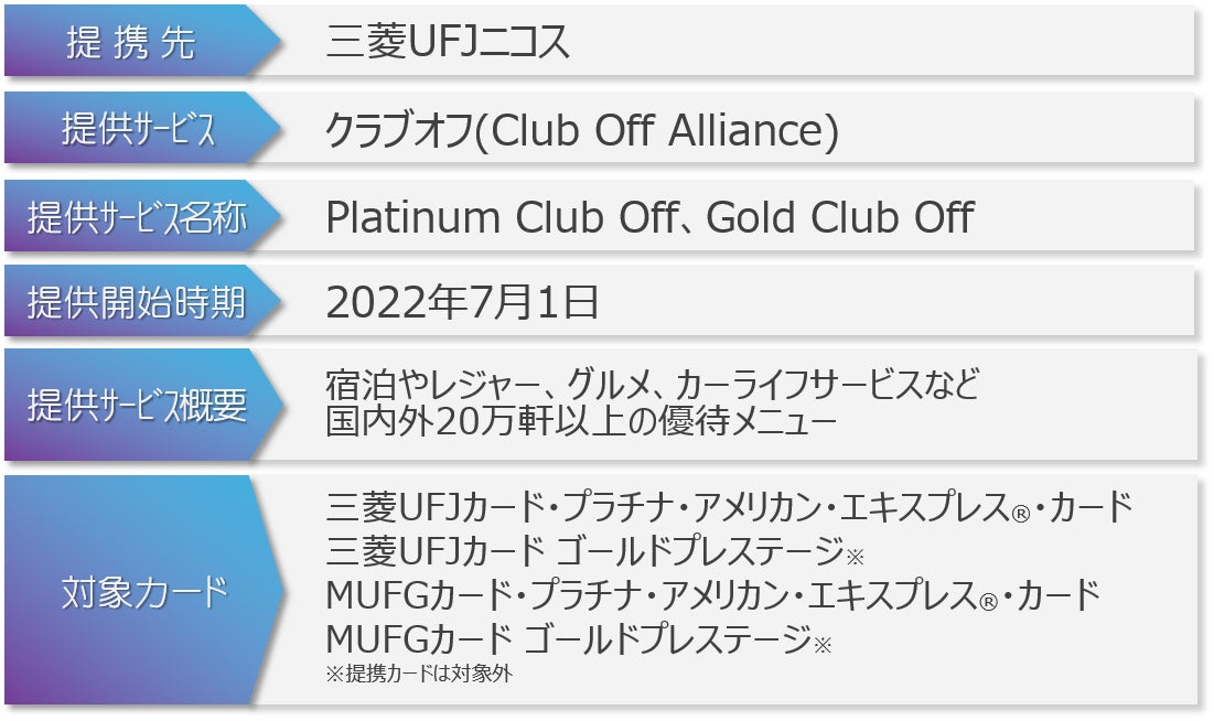 クラブオフの特典は、日常使いから特別なシーンまで、日本全国でご利用いただけ、「三菱UFJカード」「MUFGカード」のさらなる会員満足度向上とお客さまニーズを的確に捉えたサービス提供を今後も展開してまいります。