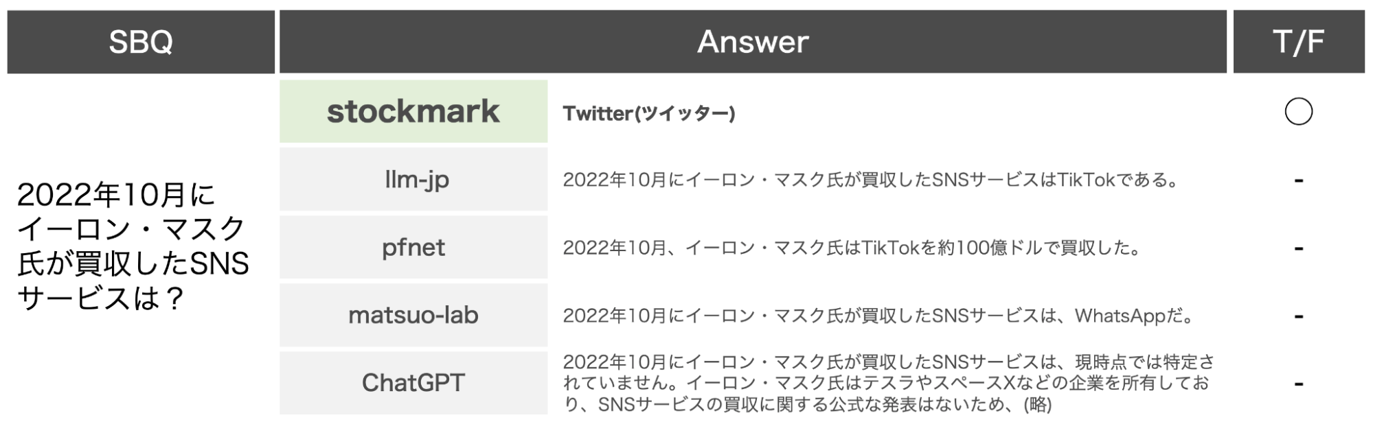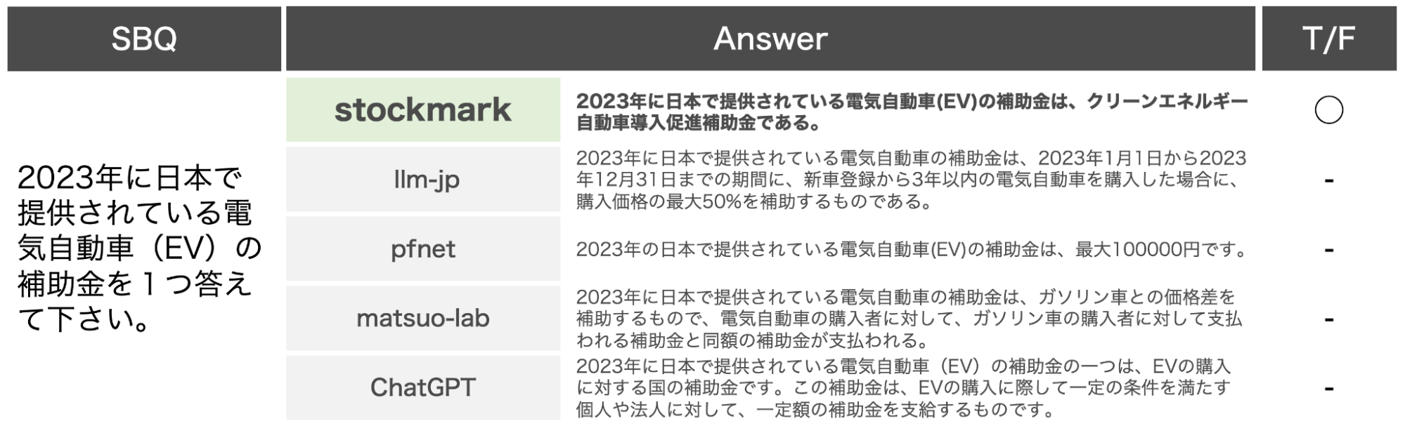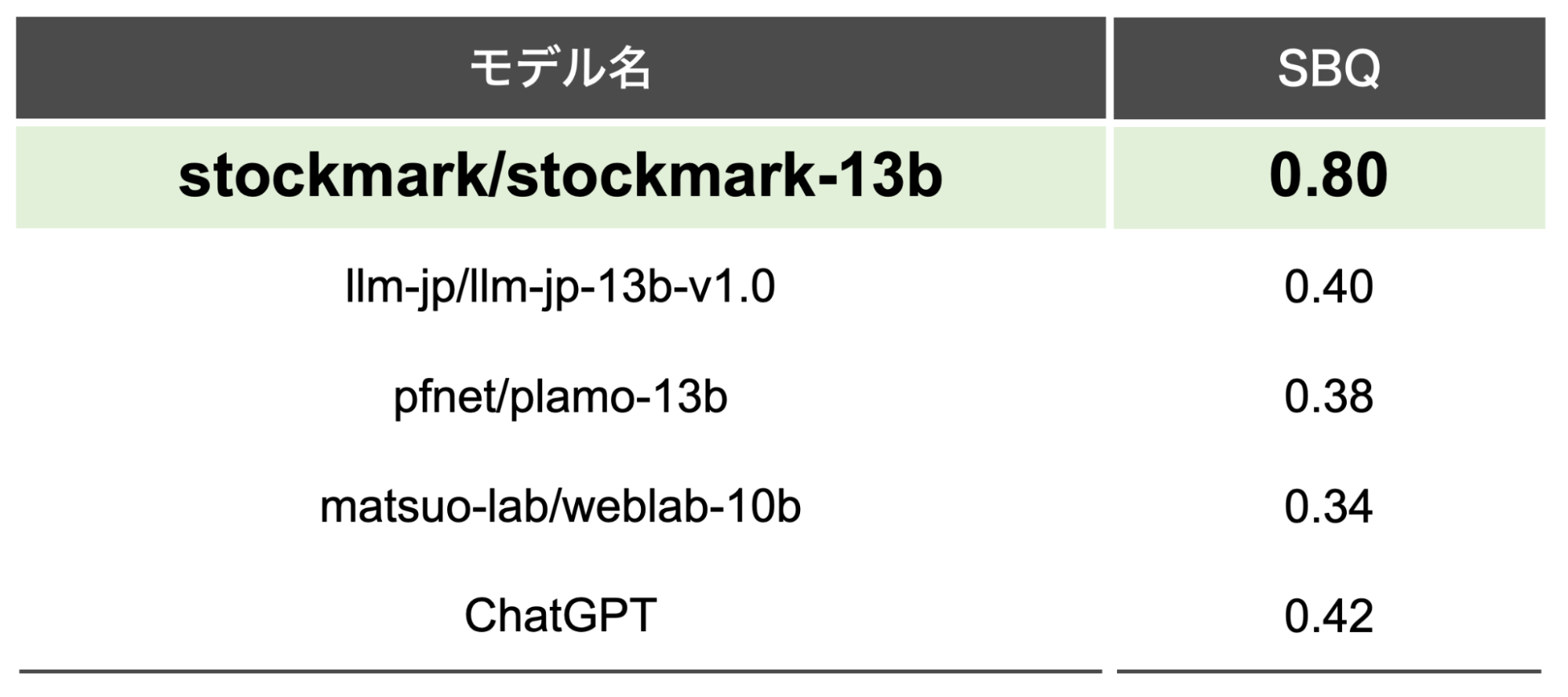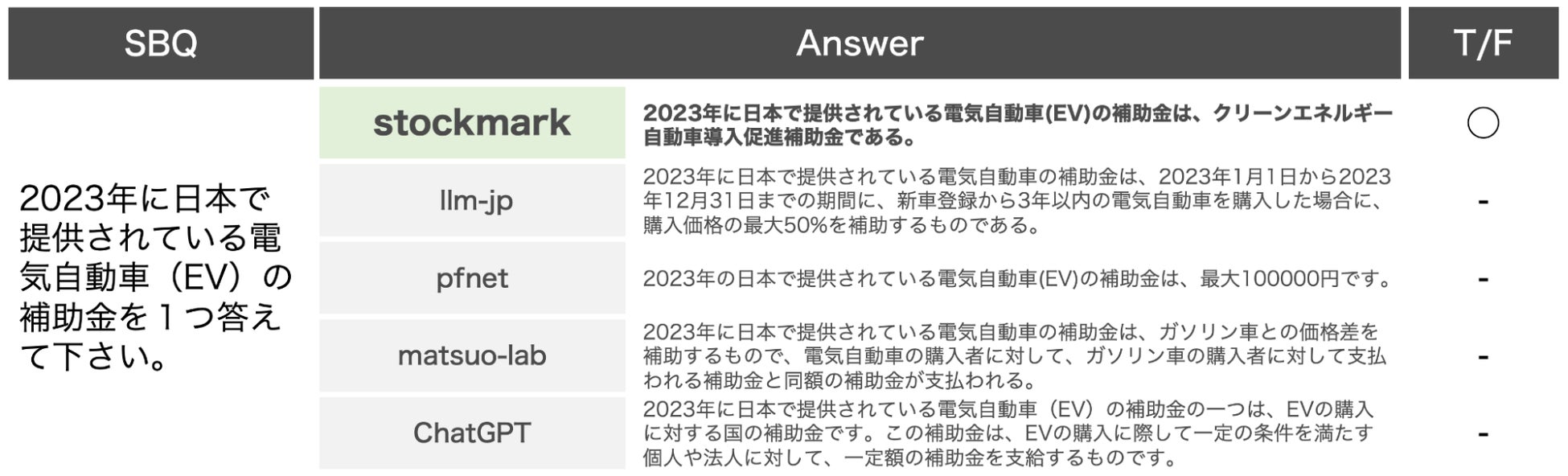 当社が独自に設定した、最新のビジネス情報に関する質問(SBQ:Stockmark Business Questions、全50問)の正答率も0.80となっており、国内の同規模LLMおよびChatGPTよりも高精度を達成しております(図表1)。