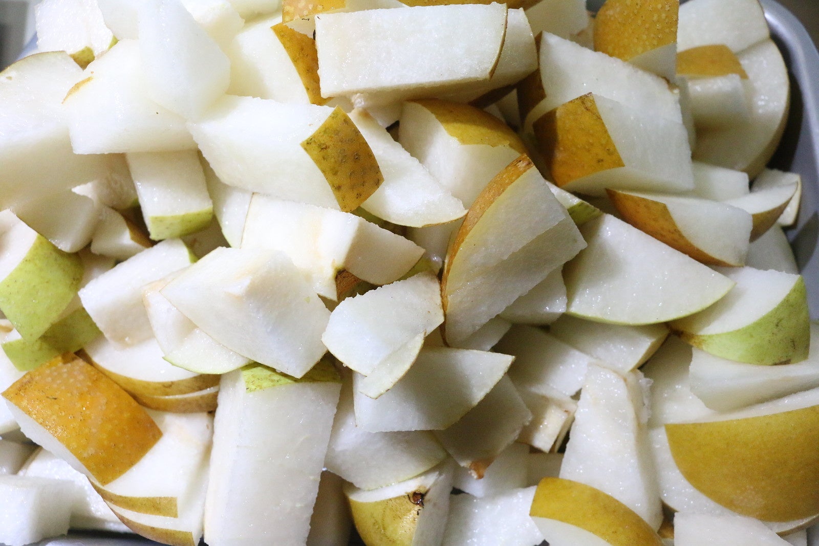 梨は細切れにしたもの、ペーストに加工したもの、ジュースに加工したものを3段階に分けて加えています。