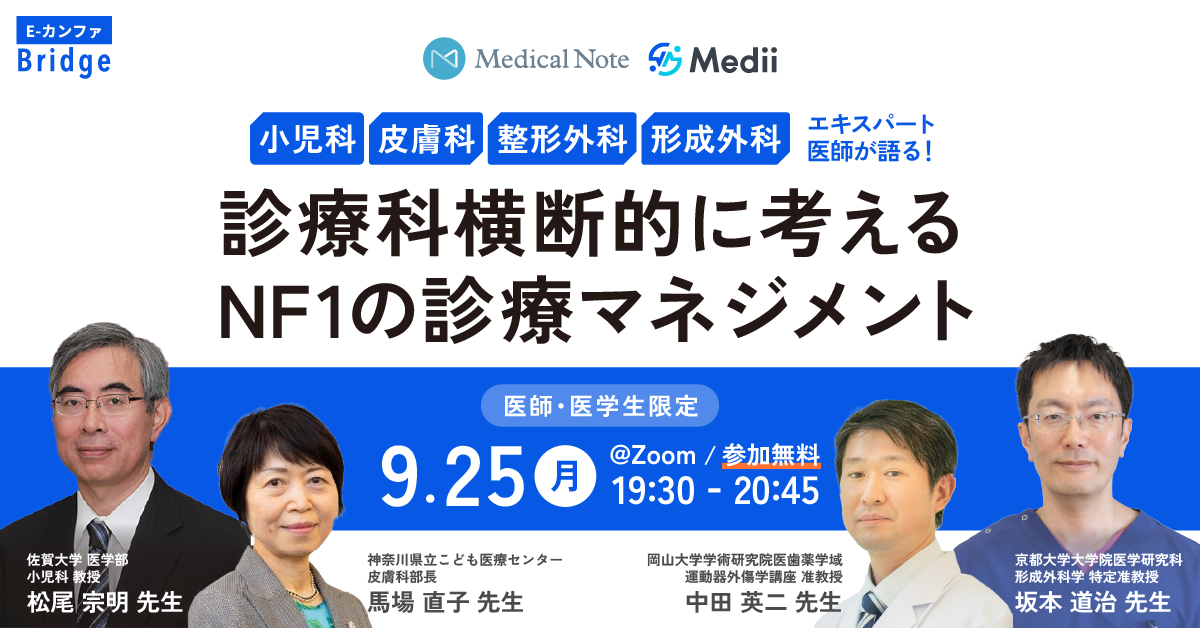 カフェ・オ・レ斑を特徴とする神経線維腫症1型(レックリングハウゼン病:NF1)は、皮膚、神経系、眼、骨等に多種病変が年齢の変化と共に出現し、全身に多彩な徴候を呈するために、様々な診療科で遭遇する可能性の多い疾患です。また、最近では、3歳以上18歳以下の外科的切除困難なNF1患者を対象とした治療薬が登場したものの、その適応の判断など診断後のフォローアップについて悩むことが多いのではないでしょうか。そこで、NF1に遭遇する可能性が高い小児科・皮膚科・整形外科・形成外科の4名のエキスパートが、実際の症例をもとにした合同カンファレンス形式でディスカッションし、各診療科の課題や視点をお伝えし、今後の診療マネジメントに生かせるセミナーを開催します。