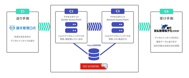 この度の疎通テストは、異なるシステム間でのデータ送受信も可能であることが特徴のデジタルインボイスにおいて、『請求管理ロボ』から出力されたデジタルインボイスデータを、ファーストアカウンティングが提供するPeppolアクセスポイントを介し、『奉行Edge 支払管理電子化クラウド』にて受信する取り組みとなります(※)。