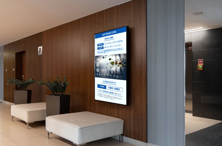 管理会社からのお知らせや点検・清掃の予定などを即時に表示・更新できるため、入居者への情報伝達が格段にスムーズになります。また、日常生活に役立つ情報や、避難情報、防犯への注意喚起なども表示が可能で、入居者の利便性や安全性の向上にもつながります。