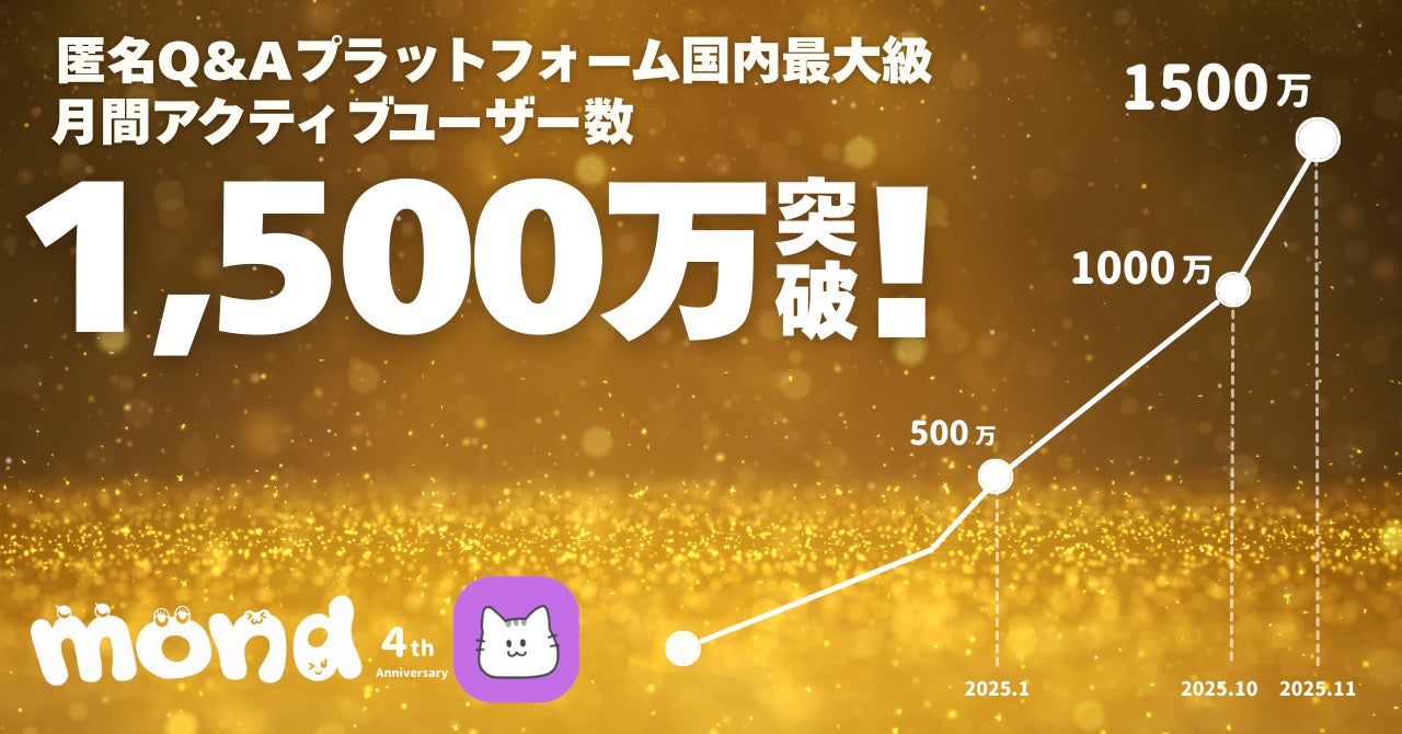 株式会社ハウテレビジョン(本社:東京都港区、代表取締役:音成洋介)が運営する匿名Q&Aプラットフォーム「mond(https://mond.how)」は、2025年11月の月間アクティブユーザー数(※)が1,500万を突破したことをお知らせいたします。大幅な利用者数増加でサービス史上最高のMAUを更新し、10月のMAU1,000万から大きく利用が伸長しています。