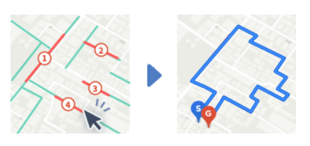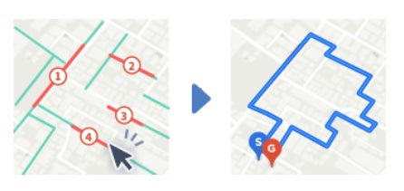 地図上で複数地点や道路をクリックで指定すると、その地点や「走りたい道路」をつないだ最適な巡回ルートを作成できます。今後は各道路に対して到着時刻と滞在時刻の設定や、車両サイズ(車/トラック/バイク)も考慮したルート検索も実装予定です。複数地点、道路を効率的に巡回できます。