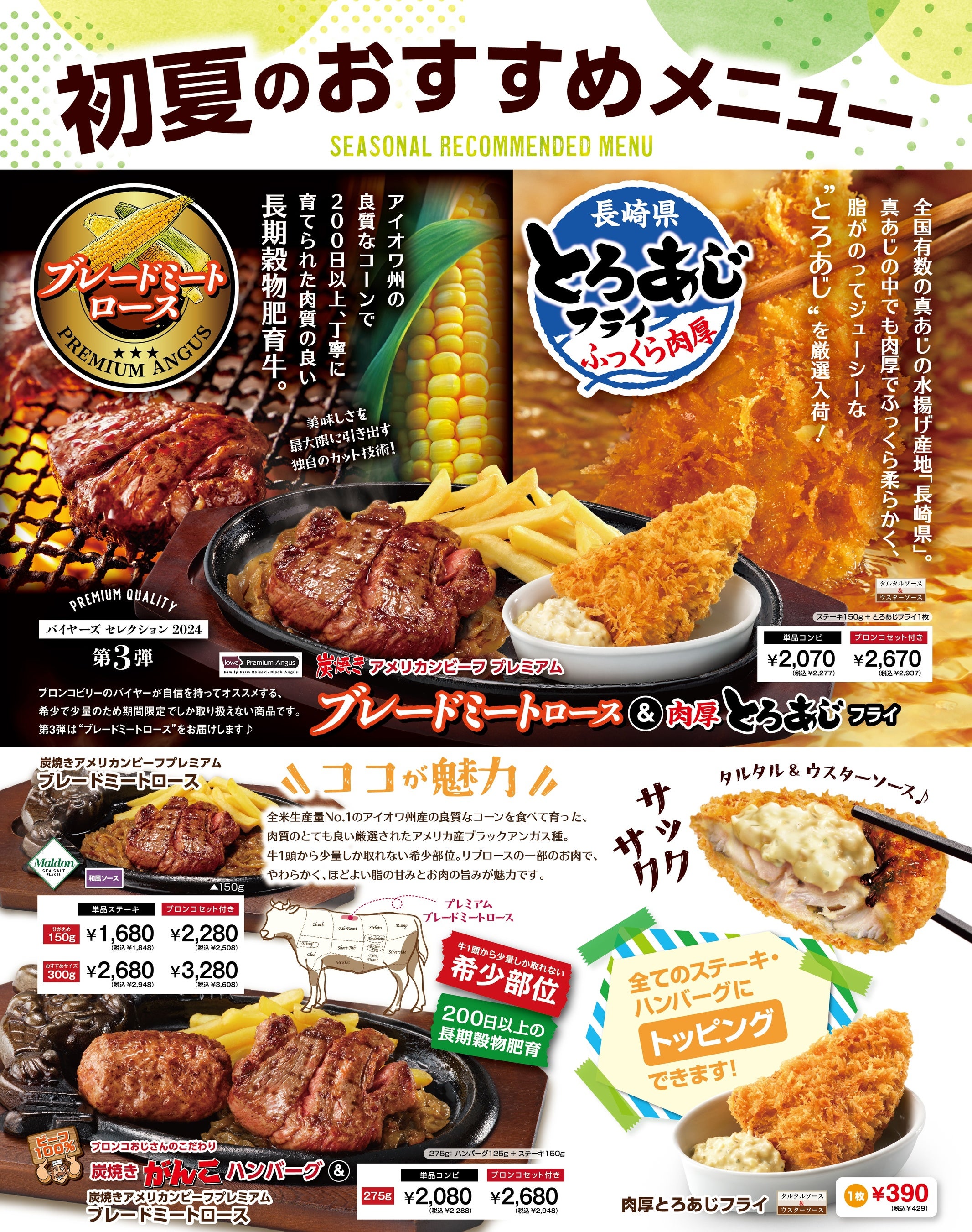 ブロンコビリー初夏のおすすめ! ほどよいやわらかさと噛むほどに旨みが溢れるロースと、今が旬のふっくら肉厚な長崎県産とろあじフライの大満足コンビが4月19日(金)より新登場!