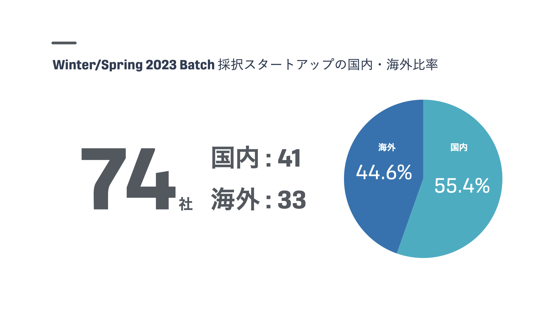 今期採択スタートアップの国内/海外比率は、国内55.4%(41社)・海外44.6%(33社)という結果になりました。