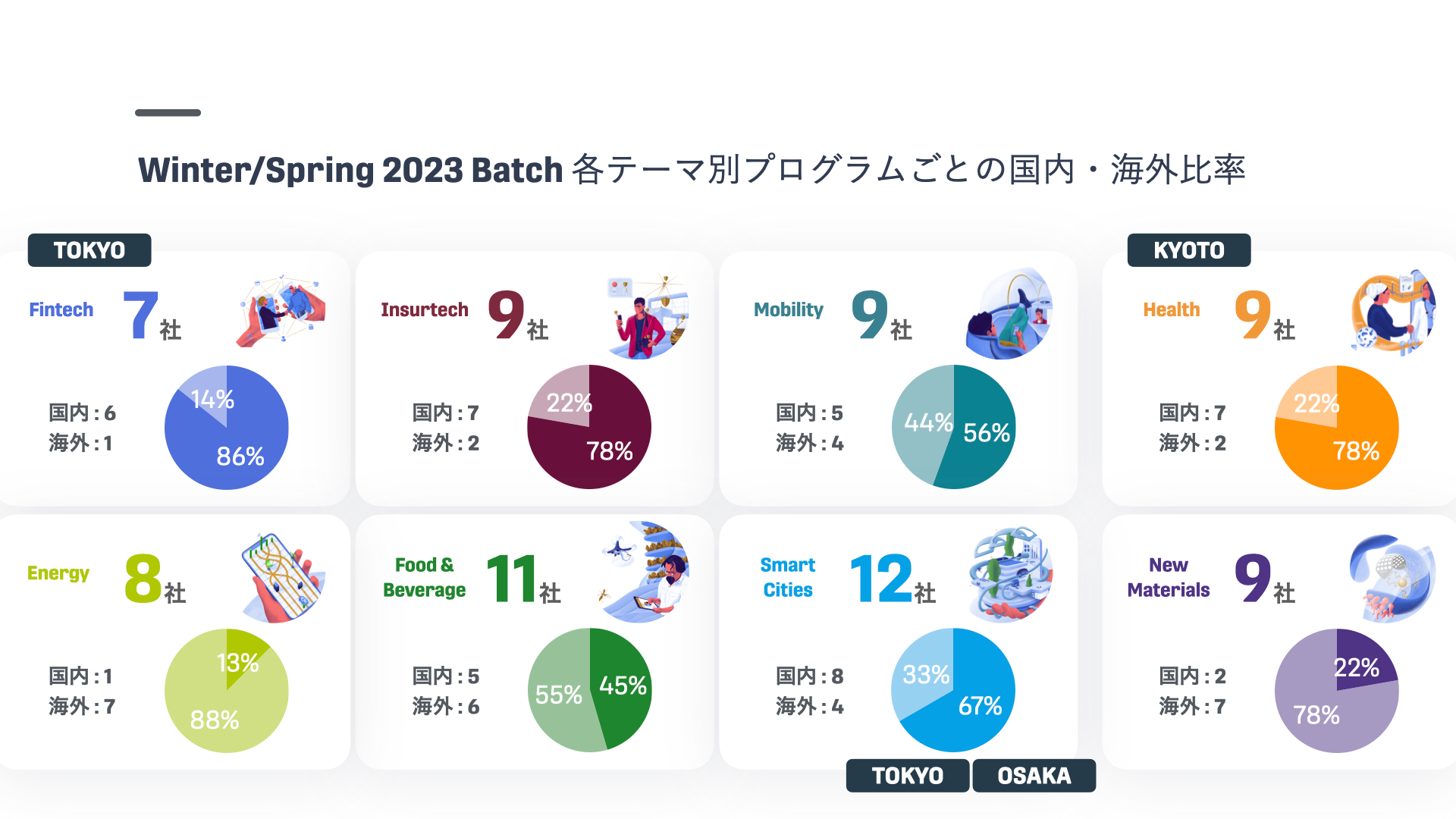 Plug and Play Japan 株式会社(本社:東京都渋谷区、代表取締役社長:ヴィンセント・フィリップ、以下「Plug and Play Japan」)は、2022年12月〜2023年3月期で実施するアクセラレータープログラムWinter/Spring 2023 Batch*において、国内外合計74社のスタートアップを採択したことを発表いたします。