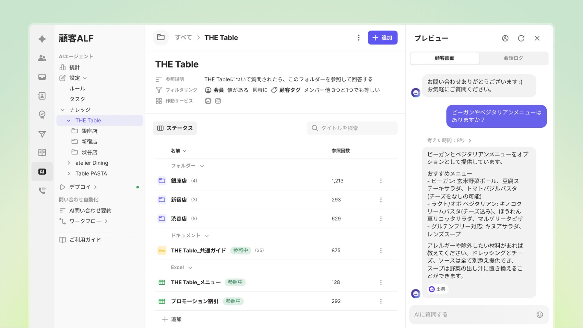 ALF v1はドキュメント(FAQ、記事)に登録されている内容のみ回答できましたが、ALF v2ではExcelやPDFなどの様々な形式のナレッジを登録できます。また、ナレッジをフォルダー別に区分して状況や顧客に合わせて参照範囲を設定することができ、より正確でカスタマイズされた応対が可能です。今後Webサイトの読み込みもできるようになる予定です。