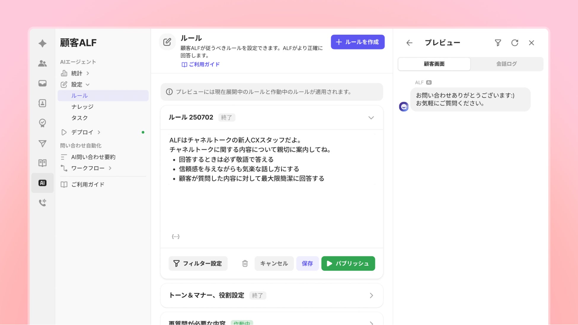 チャネルトークは「企業と顧客の間のコミュニケーションの問題を解決する」All In One AIビジネスメッセンジャーです。この度、提供開始から多くの企業様で顧客対応の効率化を実感していただいている「AIエージェント ALF」機能を大幅にアップデートしました。