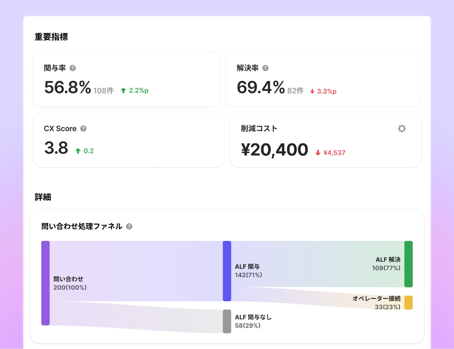統計機能も新しくなり、ALF v2では、問い合わせの成果を一目で確認できます。ALFの問い合わせへの参加比率、顧客の質問に対する有意義な回答した際の解決率、CX Score、そしてALFを活用することで削減できた費用の概算までを1つの画面で確認できます。