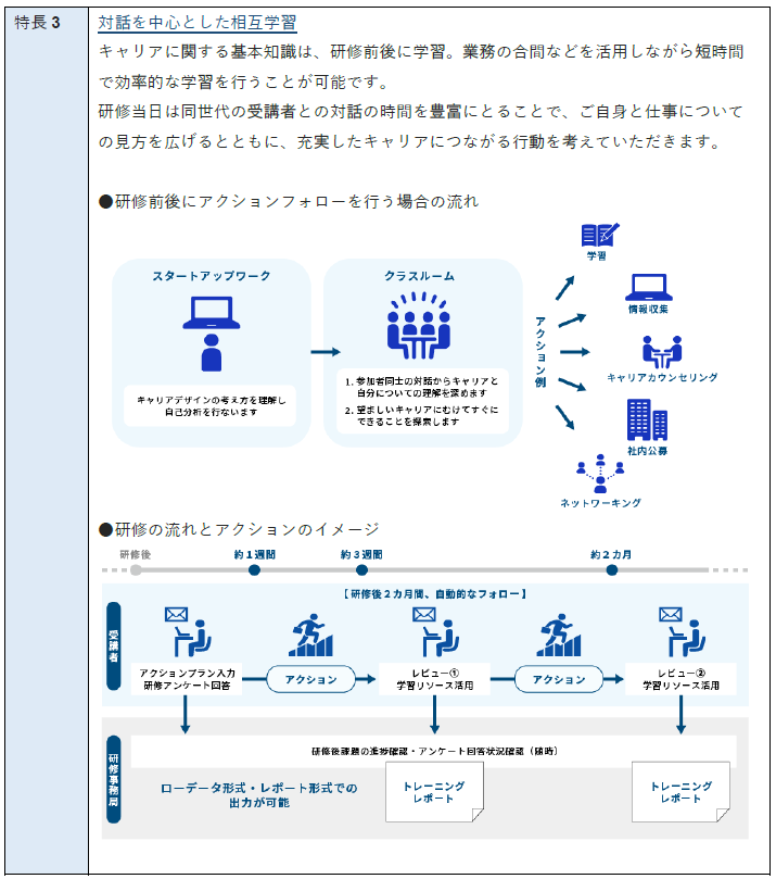 不確実な時代における、今日的なキャリア・キャリア開発について理解し、今の仕事や環境の捉え方を変えるプロセスを通して、具体的なキャリア開発行動につながる新しい形のキャリア研修です。