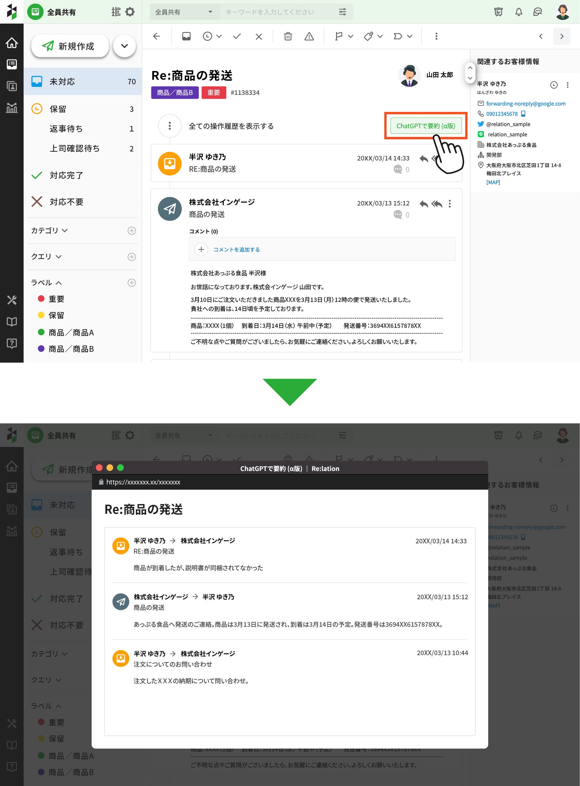 別の社員が担当していた件を引き継いだ際に【要約ボタン】をクリックするだけで、これまでどのようなやり取りをしていたのかすぐに把握できる。