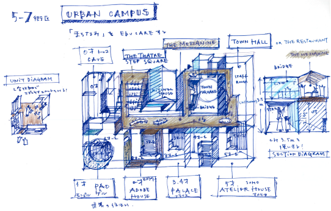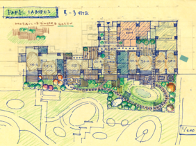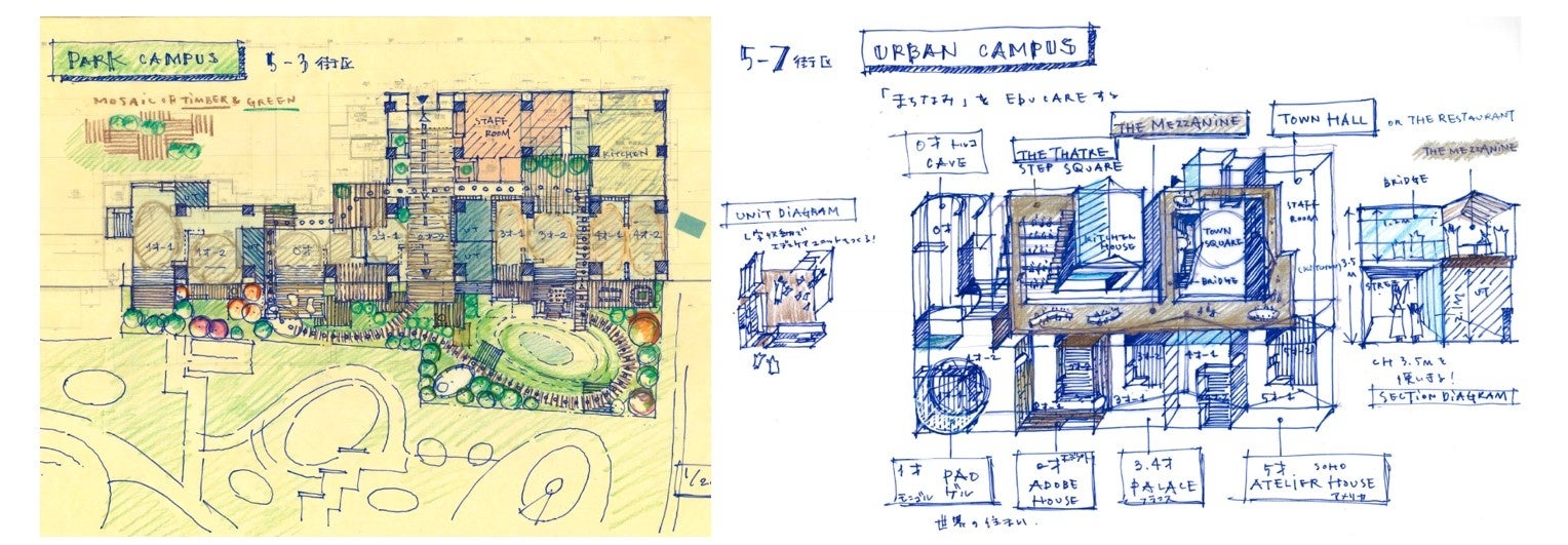 都心にいながら水辺に囲まれた場所 HARUMI FLAG に二つのナーサリースクールを設計させていただきました。このまち全体に広がるオープンスペースすべてを活動のキャンパスととらえ、(仮称)ポピンズナーサリースクールHARUMI FLAG PORT VILLAGEは、公園ランドスケープと一体的につながるPark Campus、(仮称)ポピンズナーサリースクールららテラス HARUMI FLAGは、都市のまちなみをそのまま延長して取り込んだUrban Campusとして、異なる二つのコンセプトを持たせています。
