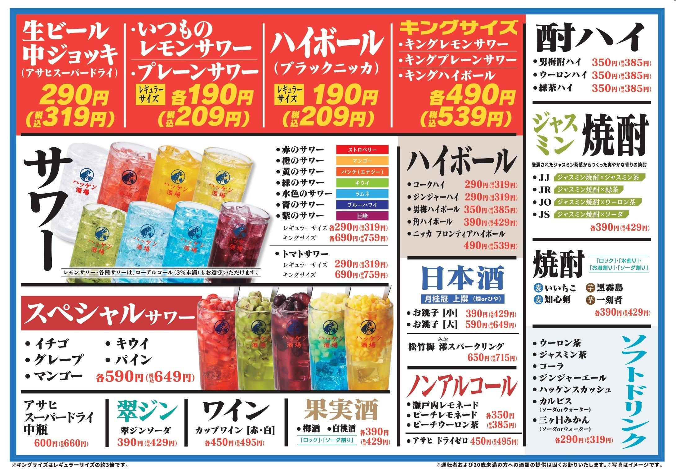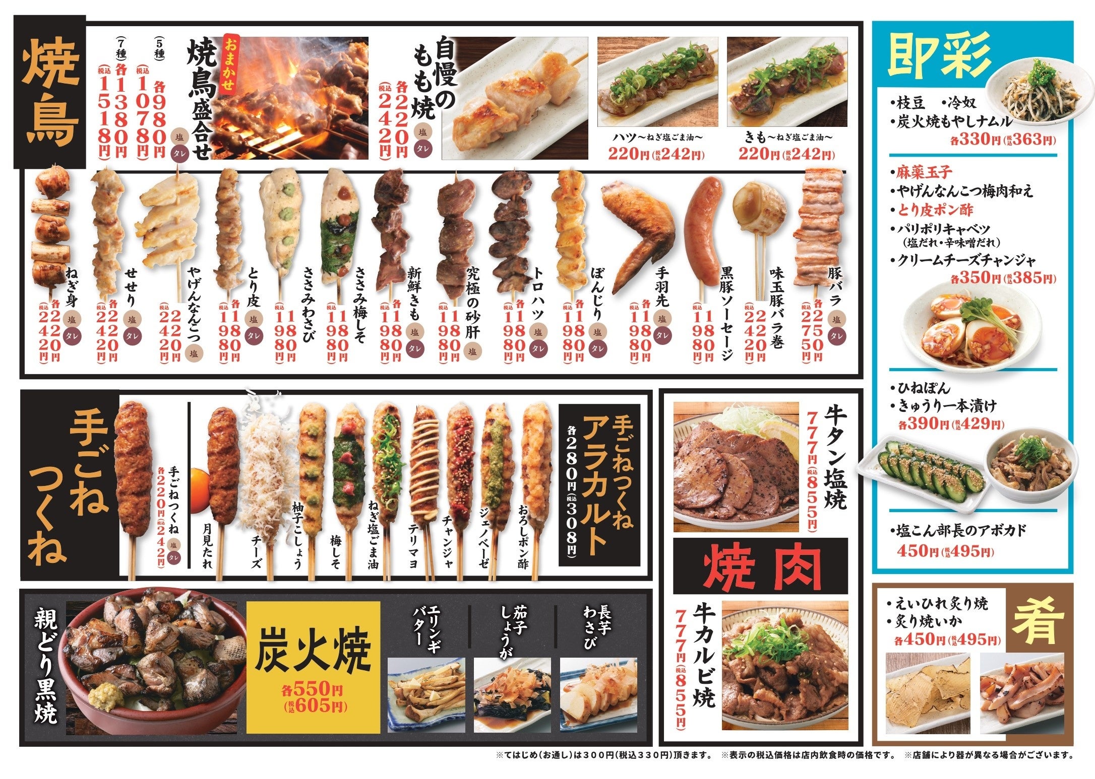 「ハッケン酒場」は、名物の焼鳥をはじめ、多彩な酒場メニューを提供しています。「溺れる塩かわ」、「やみつき辛チキ」、「特製!!鶏チャーシューエッグ」や新感覚の「〆のジョッキ麺」など、バラエティー豊かなラインナップで皆様をお迎えいたします。