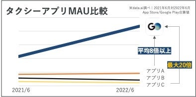 全国のタクシー営業収入はコロナ禍の影響を受け、コロナ禍前と比べて依然減少傾向の中、『GO』は注文数および乗車までを指す配車数が順調に伸長しています。MAU(月間アクティブユーザー数)も、直近1年で大きく成長しており、直近の2022年6月度では他タクシーアプリ(当社を除くMAU上位3社)の平均8倍以上、約5〜20倍※2とその差は開き続けています。