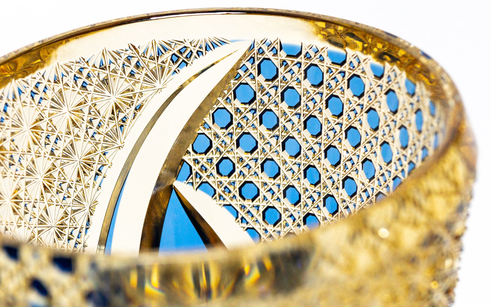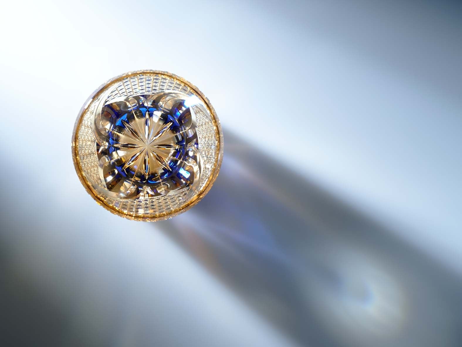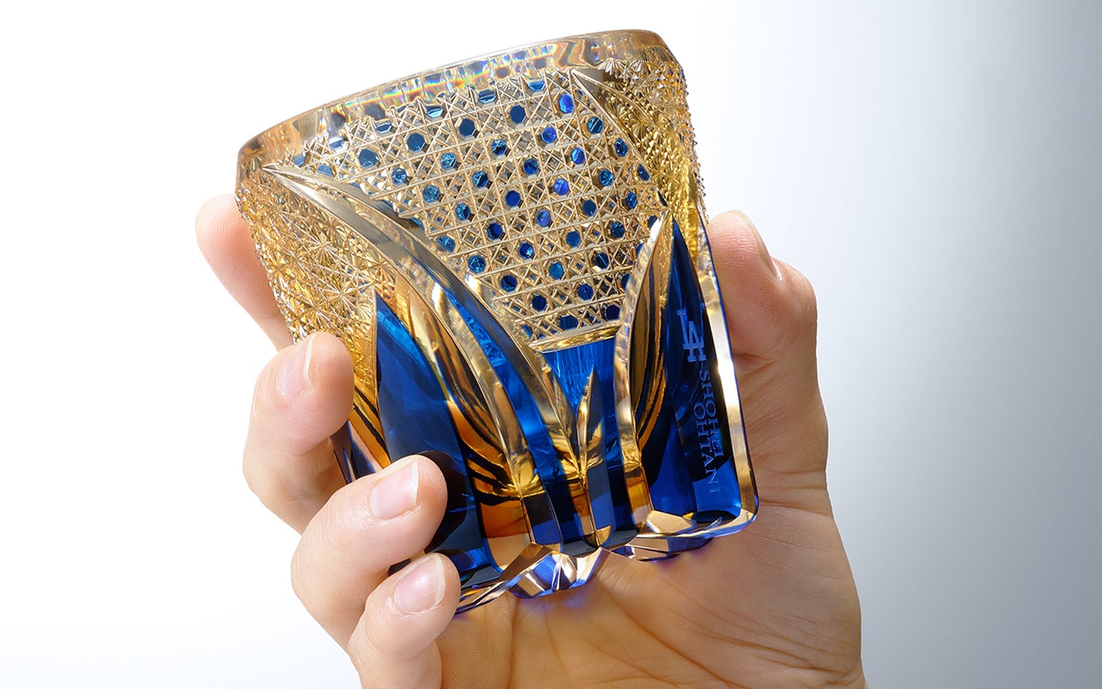 カガミクリスタルで作られた、日本最高峰の美しさを持つ「クリスタルガラス」を使用。透明度があり光の屈折率が高いため、水晶のように光輝くのが特徴です。今回使用したグラスはその中でも高い技術を用いて作られた、青色と琥珀色の2色グラス。外側の青い面を削ることでもうひとつの色が現れ、2色のグラデーションが優美に輝きます。