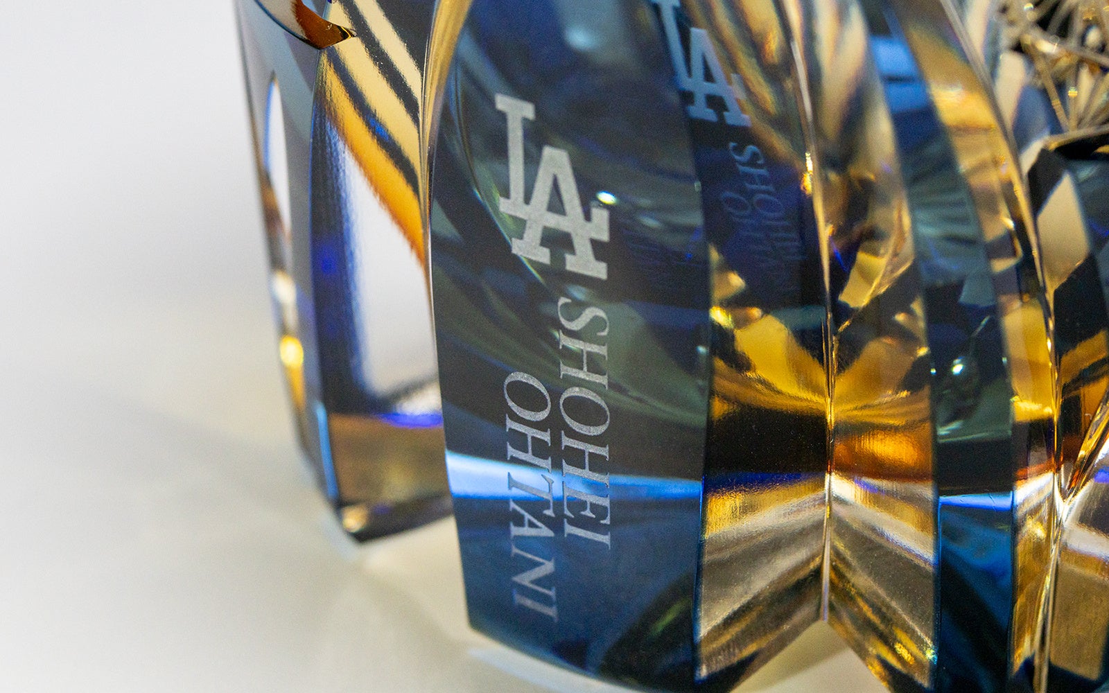 グラスはドジャースのイメージカラーである青色のクリスタルガラスを使用。グラスの下部には大谷翔平選手の名前とロサンゼルス・ドジャースのチームロゴ「LA」がサンドブラストで刻まれています。
