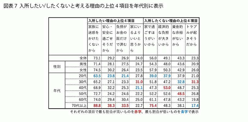 入所したい/したくない理由について年代別に見ると(図表7)、「家族に迷惑をかけたくないから」と回答した人の割合は高齢になるほど高くなっています。同様に「家で過ごすほうがいいから」入所したくないと答えた人の割合も、高齢ほど高いです。