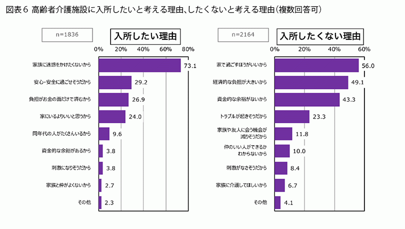 入所したい/したくない理由を聞くと(図表6)、入所したい理由のトップは「家族に迷惑をかけたくないから」(73.1%)でした。2位以下とは40ポイント以上の差をつけて、ダントツの1位です。