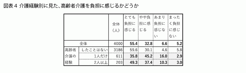 図表4のとおり、介護経験のある人とない人を比べると、「とても負担に感じる」「まったく負担に感じない」と回答したのは介護経験のある人のほうが低く、逆に「やや負担に感じる」「あまり負担に感じない」と回答したのは介護経験のある人のほうが高くなっています。実際やってみて「想像していたより楽だった」「想像していたより大変だった」と思い直す人がそれなりの割合いるのでしょう。