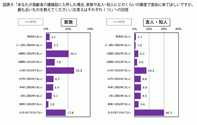 まず家族の面会については、最も割合が高かったのが「1ヶ月に1回は来てほしい」(25.5%)、2位が「1週間に1回は来てほしい」(20.4%)でした。1ヶ月に1回以上の面会を希望する人は合計で約6割ですが、「まったく来てくれなくてよい」と回答した人も17.8%いました。