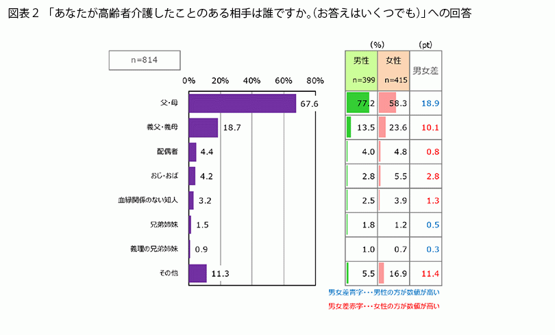 介護経験のある人に介護の相手を聞いたところ(図表2)、「父・母」が67.6%、「義父・義母」が18.7%で、それ以外の項目は10%以下でした。「父・母」については、男性のほうが約20ポイント高く、「義父・義母」については、女性のほうが10ポイント以上高いです。この違いは何から生まれているのでしょうか。