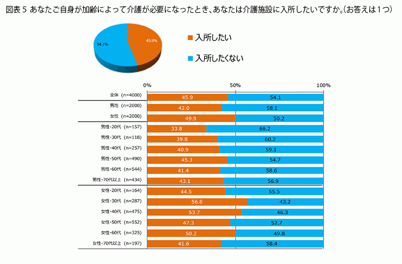 一方、入所したくない理由のトップは「家で過ごすほうがいいから」(56.0%)で、2位の「経済的な負担が大きいから」(49.1%)とは10ポイントも差がついていません。また、3位が「資金的な余裕がないから」(43.3%)ですが、2位、3位とお金に関する理由が続きました。