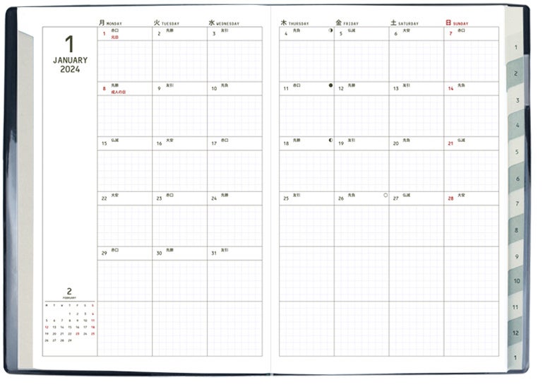 4mm方眼フォーマットのマンスリーページ。予定やメモを綺麗に書けます。