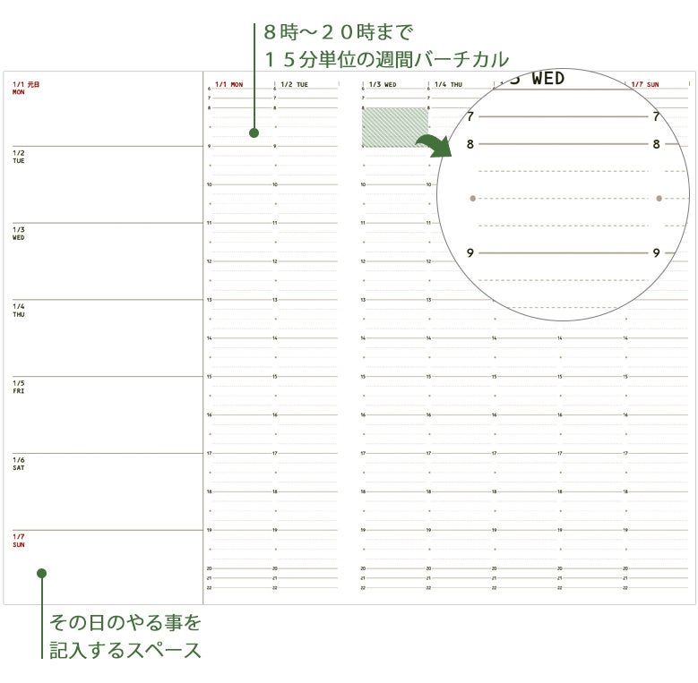 1週間の予定を書き込めるウィークリーページ。15分単位で予定を記入できるバーチカル仕様となっています。ページの左側はその日の予定を書き込むTODO管理メモ欄が設けられています。