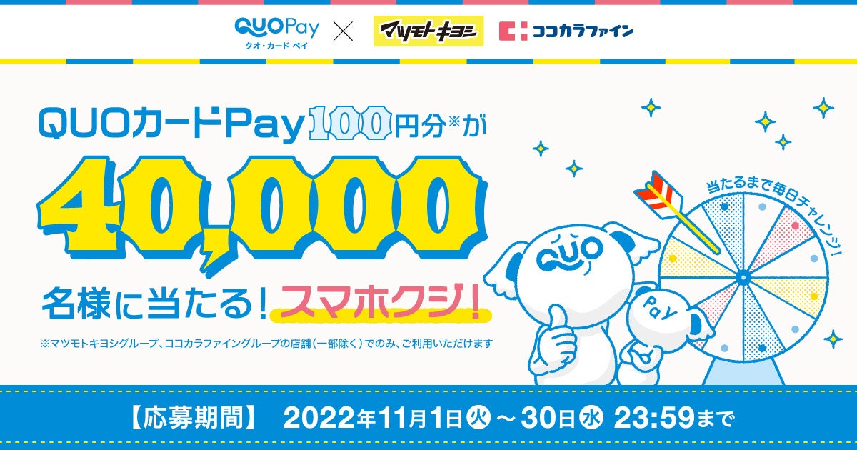 抽選で40,000名様に、100円分のマツキヨココカラ&カンパニー専用QUOカードPay