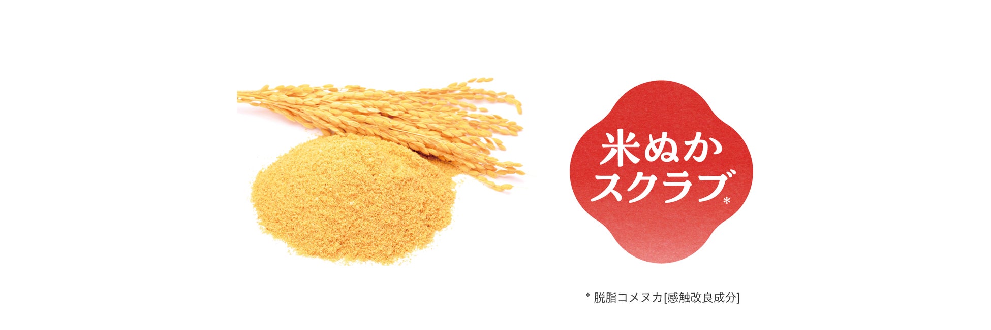 肌あたりのいい米ぬか*5の天然スクラブを配合。微粒子の米ぬか天然スクラブ*5で毛穴汚れや古い角質をやさしくオフします。
