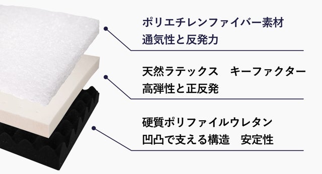 本製品はラテックス本来の良さを生かすために、ラテックスを中心にポリエチレンファイバーと硬質ウレタンを用いた3層構造のマットレスとなっております。(特許出願中)